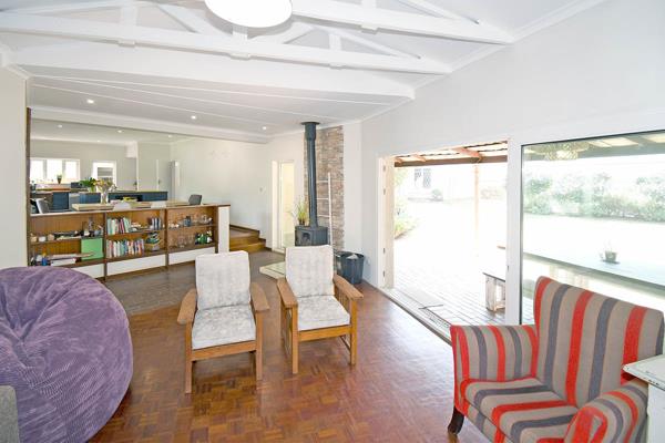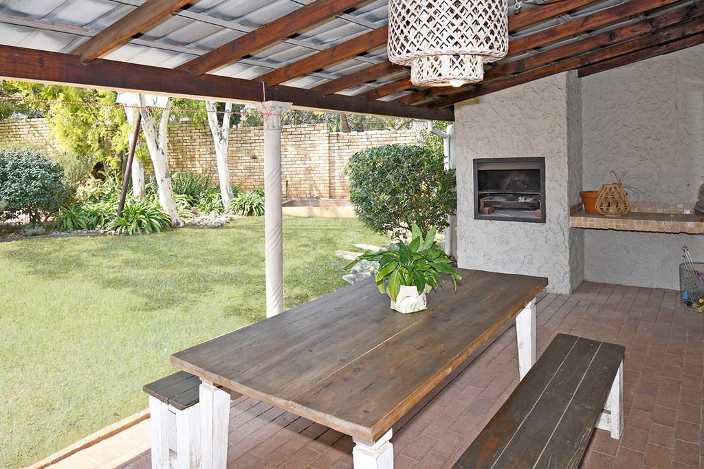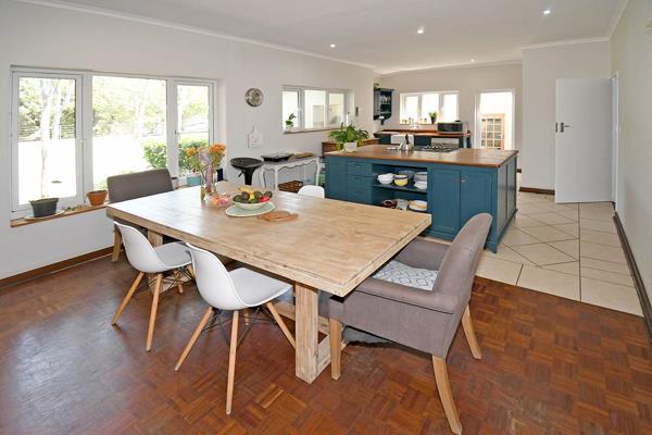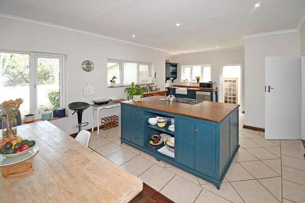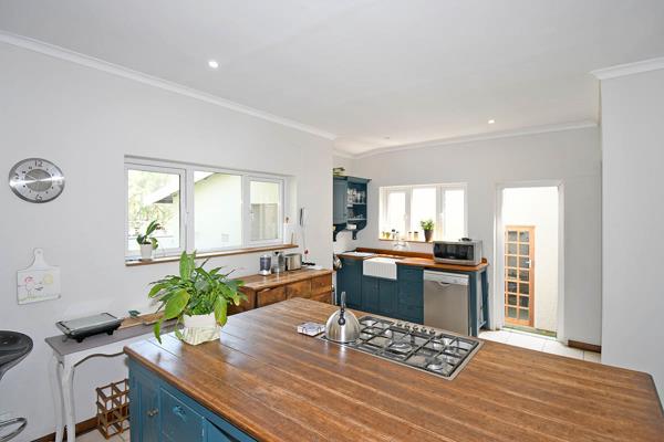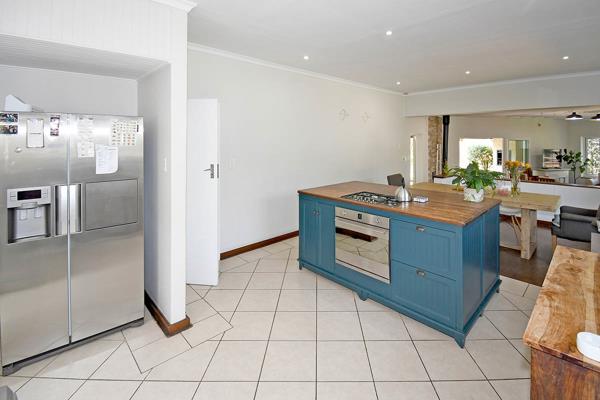 The heart of the home is the open-plan chefs kitchen, featuring a large central butchers block with a wooden top, gas hob, and under-counter electric oven. The kitchen integrates beautifully with the dining area and lounge, creating a welcoming space for family living. The patio also boasts a built-in braai for year-round outdoor enjoyment.