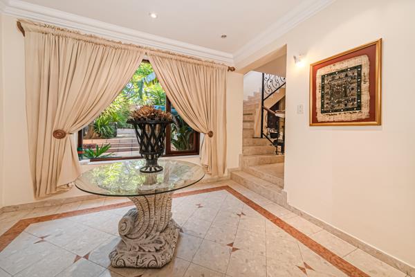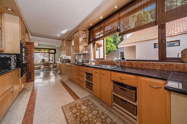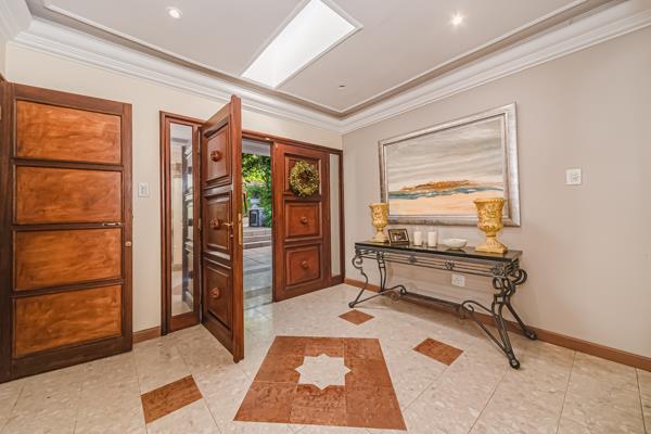 The grand entrance hall, overlooking a serene internal courtyard, sets the tone for the homes warmth and elegance. The sophisticated lounge and dining area, featuring a marble fireplace, opens through double sliding doors onto a spacious patioperfect for entertaining. From here, take in breathtaking views of the sparkling blue pool, gazebo, and lush garden, all complemented by a built-in braai area.