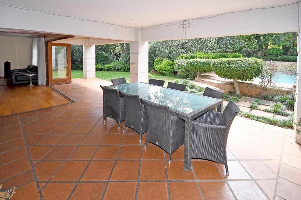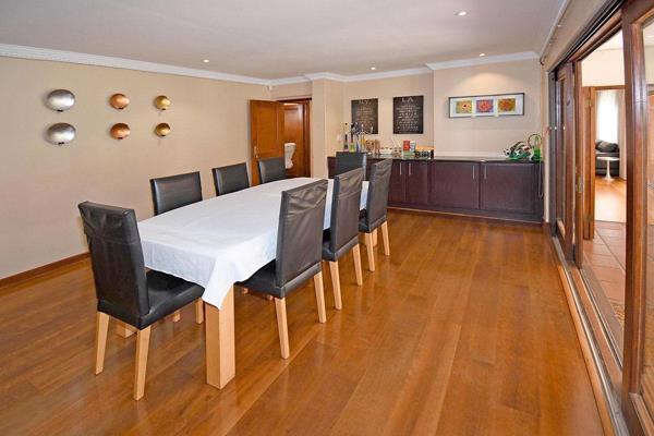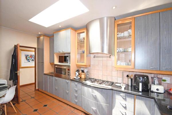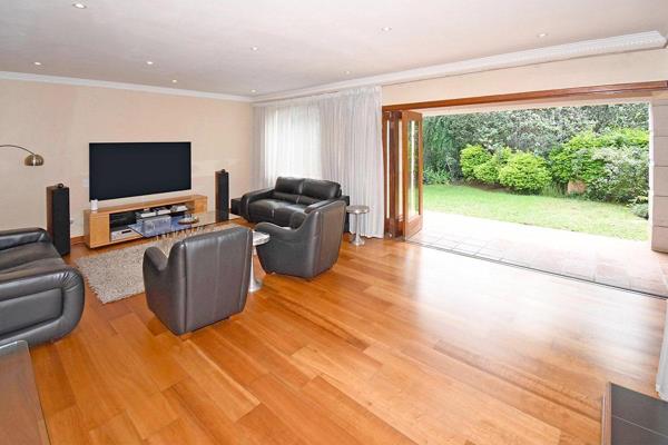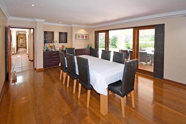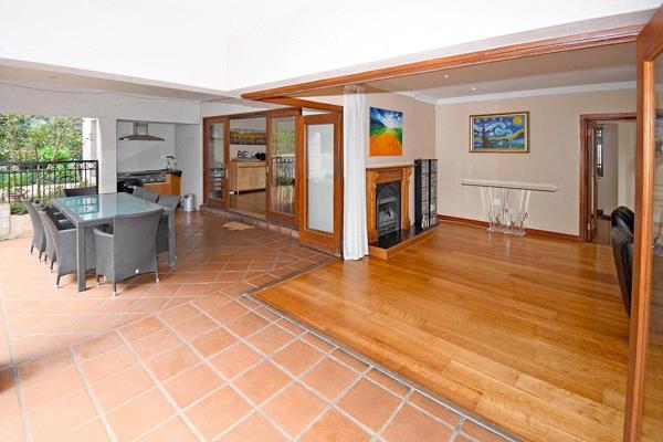 The home welcomes you with a stylish lounge featuring a gas fireplace, seamlessly opening to a covered patio, alfresco entertainment area, and sparkling pool. A grand formal dining room with a fitted sideboard creates the perfect setting for refined dinner parties. A semi-open TV loungestudy flows out to the garden, while the chefs kitchen boasts granite countertops, an AEG cooker with gas hob, space for a double fridge, and a separate scullery.