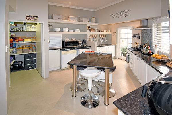 The dining area flows into the well-appointed eat-in kitchen, complete with a centre island, granite countertops, gas hob, under-counter oven, walk-in pantry, and space for two appliances.