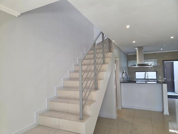Designed for modern living, the open-plan lounge and dining area seamlessly connect to a sleek, contemporary kitchen featuring a gas hob, ample cupboard space, and a breakfast counter. Large sliding doors open onto a covered patio that overlooks a pristine private pool and features a built-in gas braai ideal for stylish outdoor entertaining.