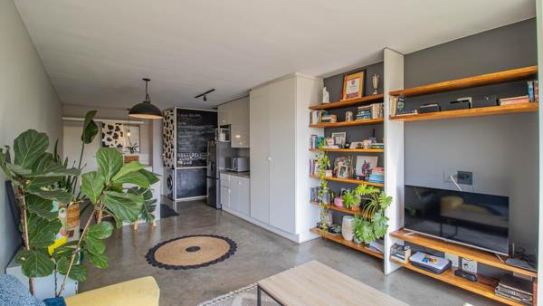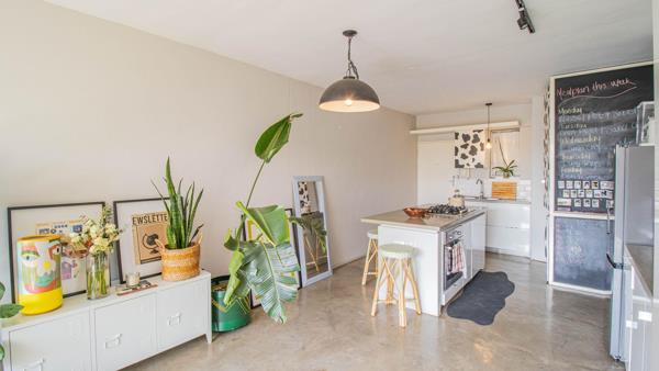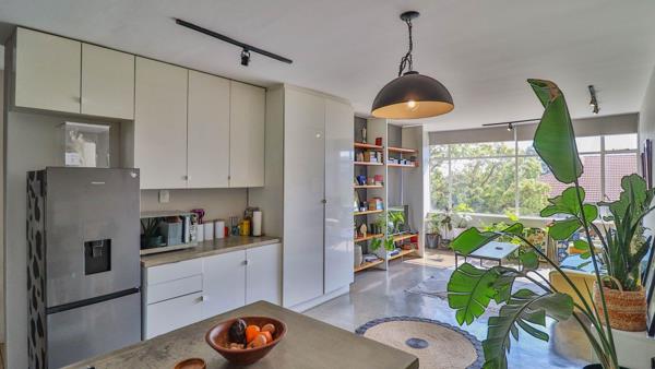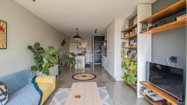 The spacious bedroom includes built-in cupboards and a luxurious en suite bathroom with double basins, a bath, and a shower. The toilet is separate, allowing it to double as a convenient guest cloakroom. Cemcrete floors and blinds are fitted throughout the unit, adding a neat and practical finish.