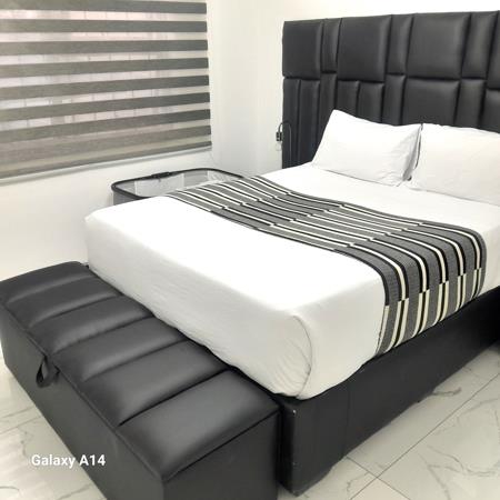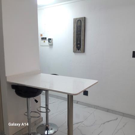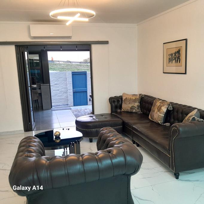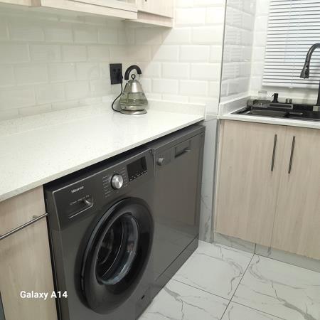 The apartment opens to a sun lounge fitted with noise-proof glass and aluminum frames. This area can be used for relaxation or as a study. The open plan loungekitchen flows seamlessly. The lounge is bright, thanks to the glossy white ceramic tiles, the 3 level LED chandelier and white walls. The kitchen has quartz counter tops, stove and hob, space for 2 appliances, a single door fridge, water purification system and a breakfast nook. A luxury black stainless-steel sink with faucet, soap dispenser, knife holder, movable washing tray and water temperature control adds to the sophistication of the apartment. The main and 2nd bedroom are spacious and have 3-level LED light fittings, ample cupboards and air conditioning. The en-suite bathroom has a luxurious tub only while the second has a shower only. The two are fitted with modern accessories and remote-controlled lights and fans. The front courtyard is fully paved.