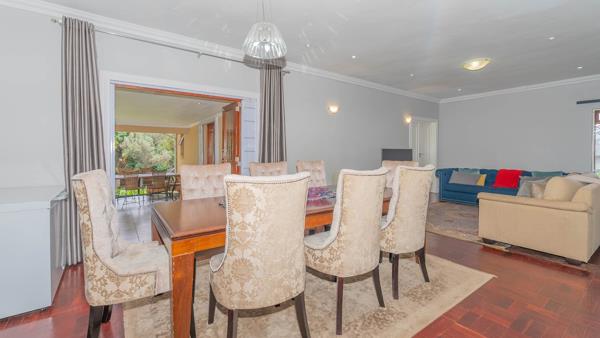 The open plan lounge and dining areas are expansive and flow effortlessly, leading out of the retractable wooden door to the covered entertainment patio fitted with down lights for ambiance, overlooking the established garden with lush greenery and a kid-friendly play area for outdoor fun, perfect for family gatherings and relaxation.