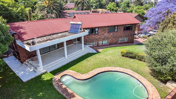 A covered patio overlooks the sparkling swimming pool and large, established garden, creating the ideal space for outdoor relaxation.