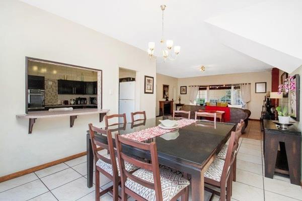The heart of the home is its large lounge with a wood burning fireplace and a bay window. It is next to the dining room that opens out to the expansive patio with a pretty water feature, overlooking the swimming pool and garden. The kitchen is a great size, allowing you to place a kitchen table and eat-in. It has plentiful cupboards and counters.