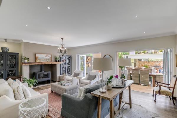 The modern classic eat in kitchen with a gas stove and separate scullery includes a tv room with a combustion fireplace. Sliders open into the entertainers dining room and a spacious lounge with combustion fireplace and dining, both have feature chandeliers and both open onto the double patio with views of the pool and entertainers dream pool house.
