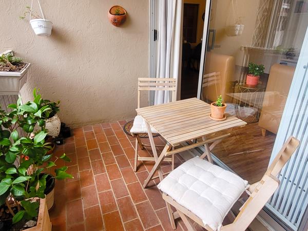 The lounge has sliding doors opening to a secluded covered balcony overlooking complex gardens and majestic, mature trees.