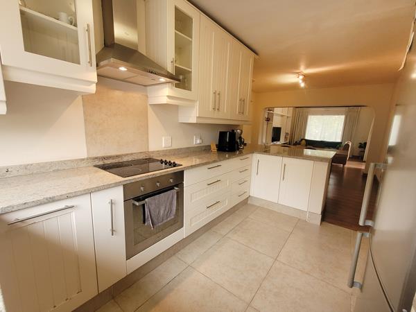 Spacious open plan lounge, dining area and modern kitchen with breakfast bar, granite counter tops and space for 2 appliances.