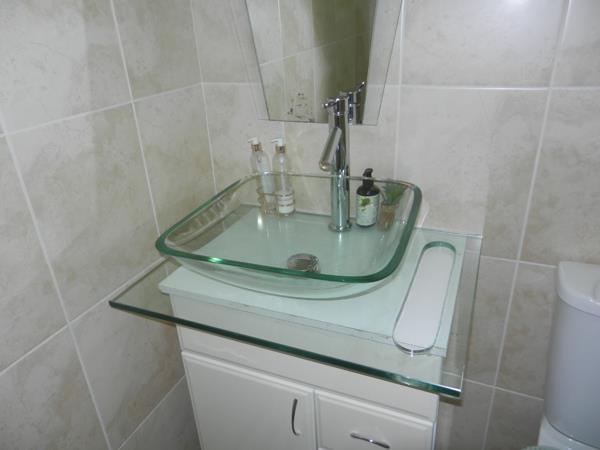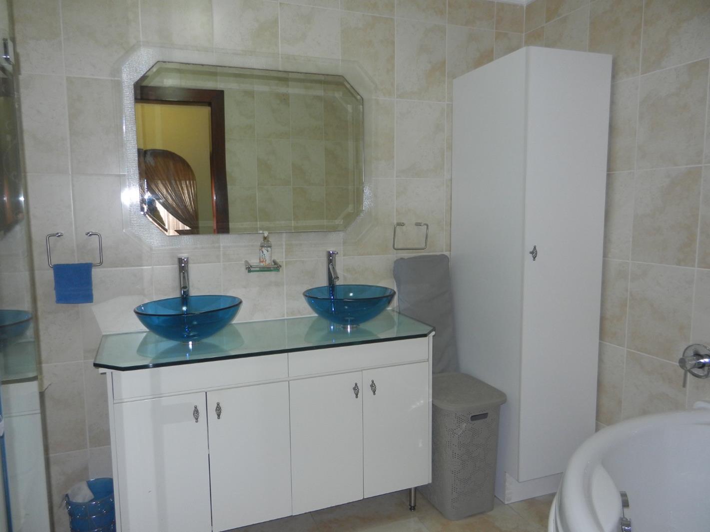 Both bedrooms are generously sized, with one benefiting from an en-suite bathroom for added privacy. The bathrooms are thoughtfully designed, including one with distinctive dual blue glass vessel sinks set on a vanity with a glass countertop, complemented by a large decorative mirror and extensive tiled finishes. Ample storage is provided by vanity cabinets and a tall linen cabinet, ensuring a clutter-free environment.