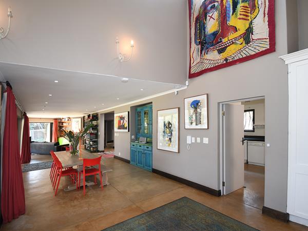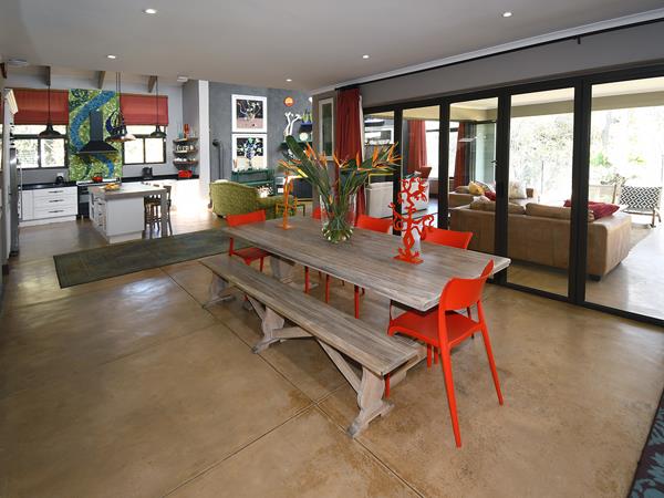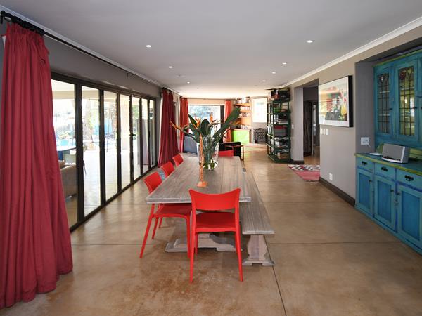 - Reception Areas: Expansive open-plan layout including a TV lounge with soaring double-volume ceilings and a cosy pot belly stove, a formal lounge with built-in fireplace, and a spacious dining area all with stackable doors that open to a manicured lawn, sparkling pool, and sweeping golf course views.