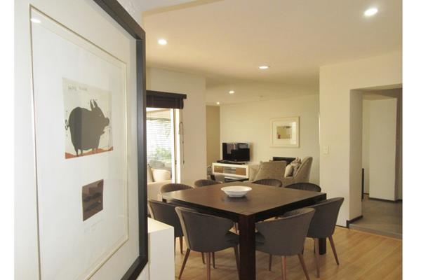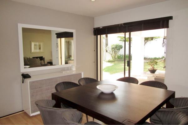 The open plan kitchen, lounge and dining area is designed for seamless living. The modern designer kitchen, with its crisp clean lines, will delight any Cordon Bleu chef. It offers a breakfast counter, has space for two under-counter appliances, double ovens, induction stove with extractor fan, and leads out to a convenient drying courtyard/back garden. The dining room is open plan to the kitchen and spills onto the patio. A cozy fireplace adds warmth to the lounge for those chilly winter evenings, while sliding doors lead out to the patio and private garden - the perfect spot to relax or entertain.