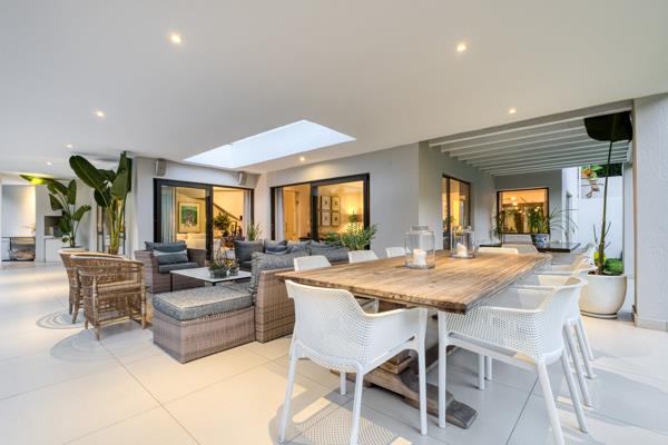 The kitchen leads to the dining room with built-in cabinetry. The formal lounge has sliders to the ultra-spacious undercover patio with a built-in braai providing an all-season entertainment hub for the executive family. The family room is air-conditioned has a gas fireplace and double-glazing leads to the patio, creating a wonderful flow.