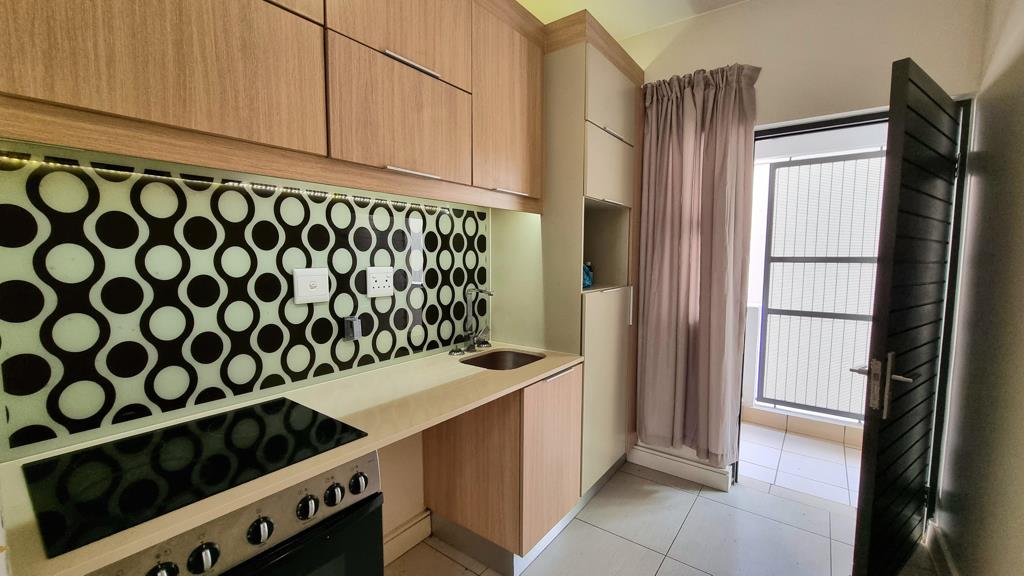 The bedroom is spacious with built in cupboards, while the bathroom boasts a shower/bath combo and rounded off neatly with vanity cupboards and a mirror finish.