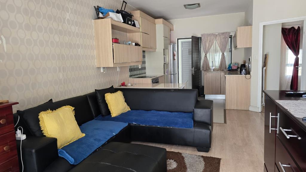 This ground-floor apartment boasts an inviting open-plan kitchen and lounge area, ideal for relaxed living and entertaining. The lounge opens through a sliding door onto a private, paved garden space, offering a tranquil outdoor retreat perfect for morning coffee or weekend braais.