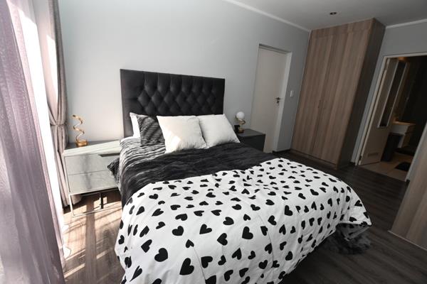 The main bedroom includes an en-suite bathroom, generous cupboard space, and a large sliding door that lets in plenty of natural light. The en-suite has a shower, bath, and vanity. The second bedroom is well-sized and located near the second bathroom, which includes a shower.