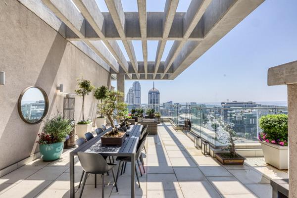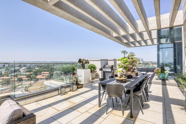 The second level of the penthouse encompasses the living spaces, including a spacious kitchen and an office area. A lounge and dining area lead out to a generous balcony overlooking the Sandton skyline, providing the perfect setting for entertaining guests. Those seeking additional privacy can arrange for exclusive dining experiences through the renowned Olives and Plates restaurant.