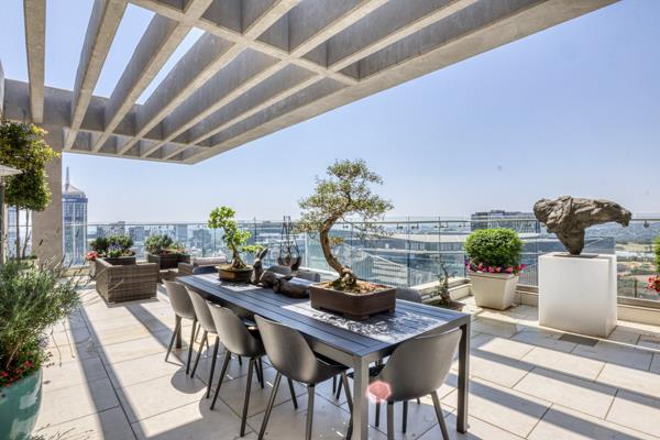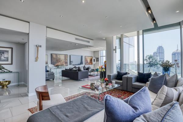 The second level of the penthouse encompasses the living spaces, including a spacious kitchen and an office area. A lounge and dining area lead out to a generous balcony overlooking the Sandton skyline, providing the perfect setting for entertaining guests. Those seeking additional privacy can arrange for exclusive dining experiences through the renowned Olives and Plates restaurant.