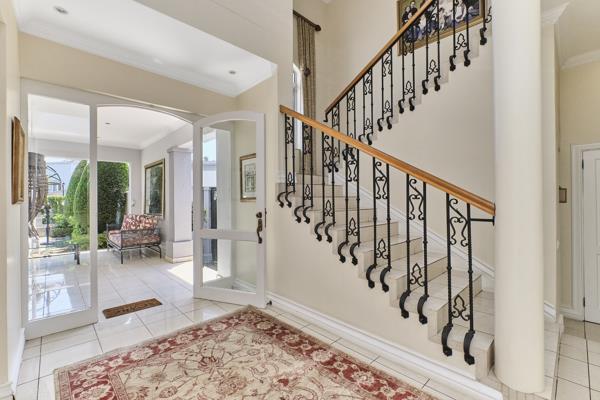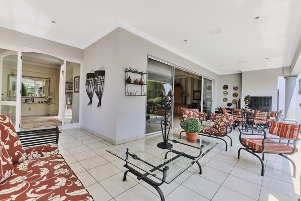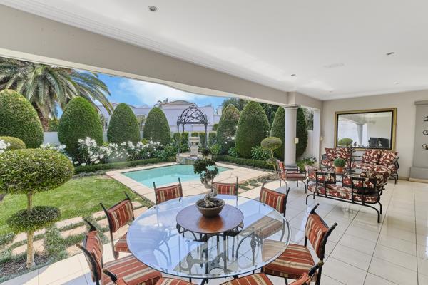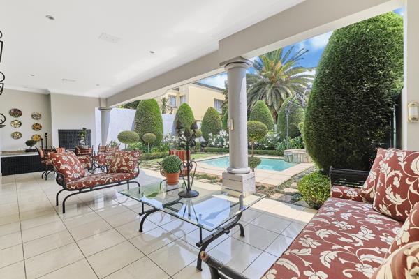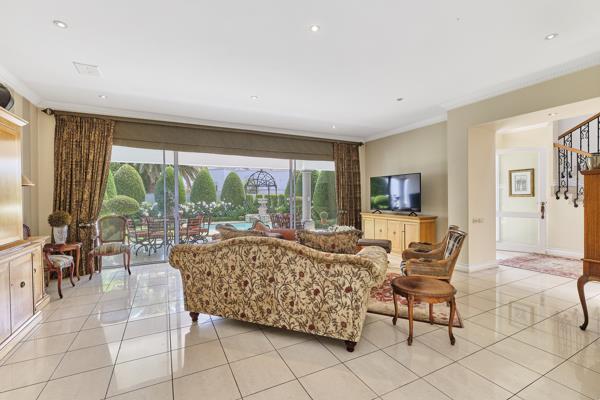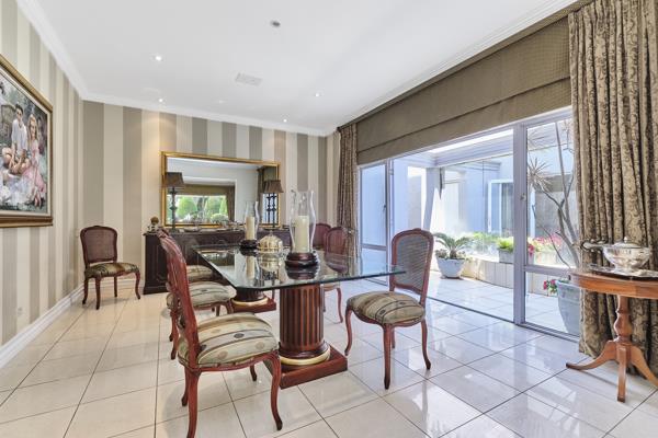 Downstairs: Upon entering, you are welcomed by an open-plan lounge that flows seamlessly onto a spacious, covered patio with a built-in braai area. Both the lounge and patio overlook a well-manicured garden and sparkling pool, creating a perfect setting for relaxation and entertainment. The lounge leads to a large dining room that looks out onto a flower-filled atrium, bringing the beauty of nature indoors.