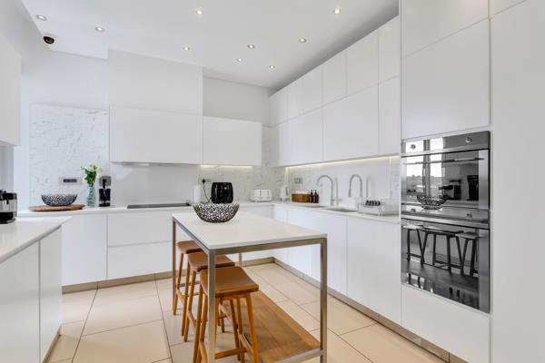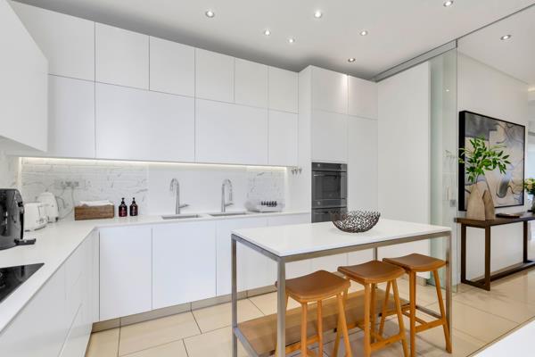 The biometrically controlled elevator will take you from your parking or the lobby, into your dream apartment, offering privacy, security and convenience. The entrance hall opens onto the spacious reception rooms, which lead out onto a sun drenched balcony, offering sweeping views of the Sandton skyline to the north and the green canopy of Sandhurst to the west.