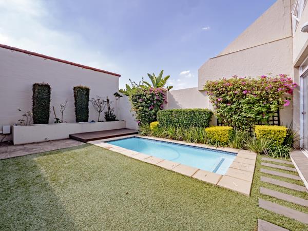 The garden has a pool and astroturf , thus rendering it low-maintenance