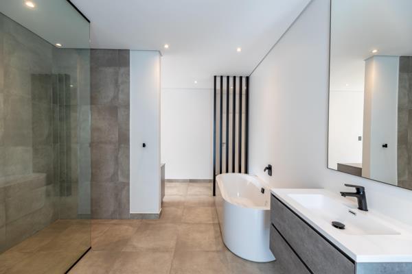 With a focus on space, light and flow, the home unfolds in clean architectural lines and warm, textural finishes. The double-volume entrance sets the tone, leading into an expansive open-plan layout where the lounge, dining and kitchen areas are proportioned for grand-scale entertaining and day-to-day comfort alike. Sliding doors open onto a deep covered patio overlooking a large wraparound garden one of the most generous in the complex allowing for outdoor living that feels both relaxed and considered.