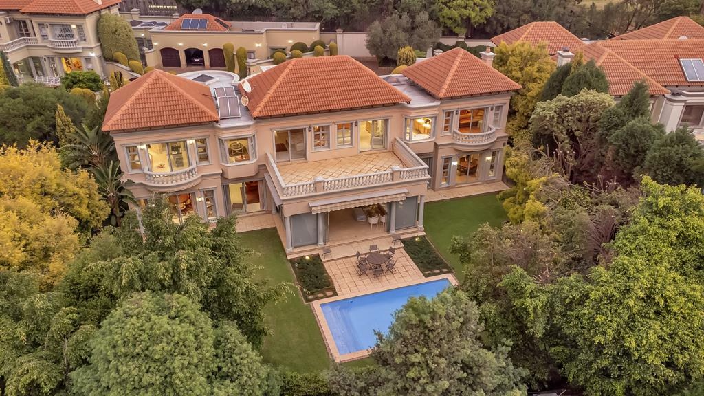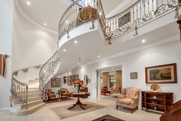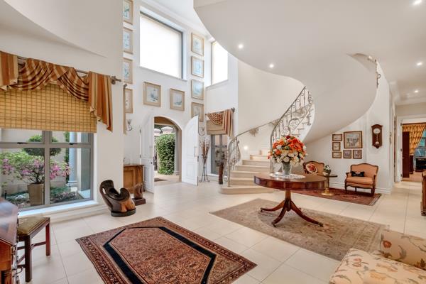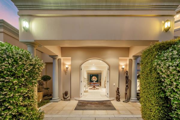 The grand entrance hall flows into the reception rooms through double retracting doors - two spacious lounges are open-plan and flow on to the entertainment patio, which has large sliding doors on to the garden and pool, as well as stacking doors on each side, to have a truly open feel. The dining room also opens to the garden with sliders and features an Italian gold-plated central chandelier.