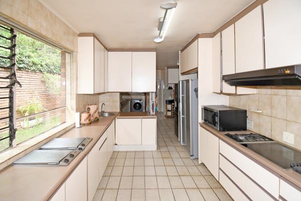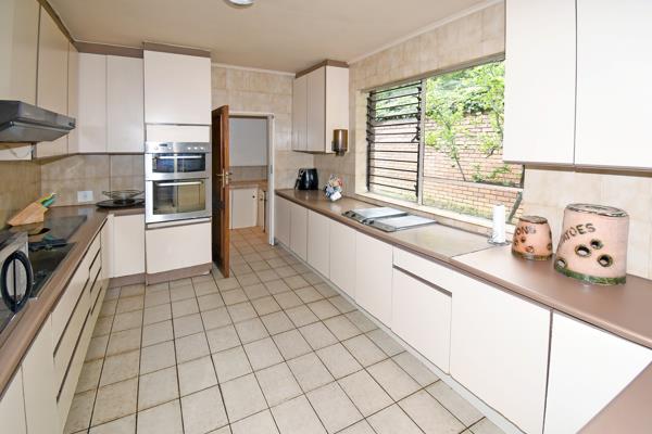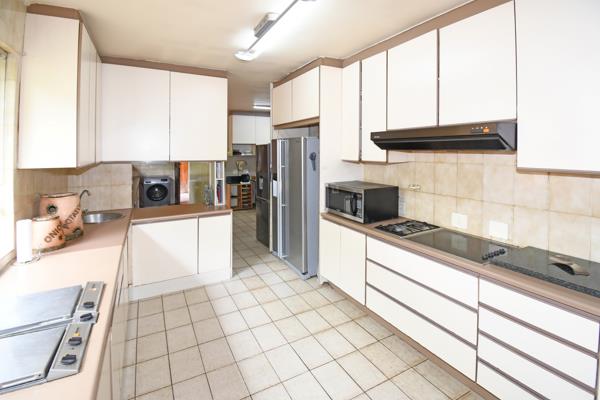 The eat-in kitchen features a walk-in pantry and scullery, space for a double door fridge and a gas and electric hob.