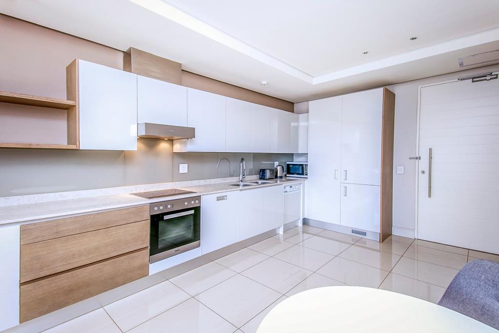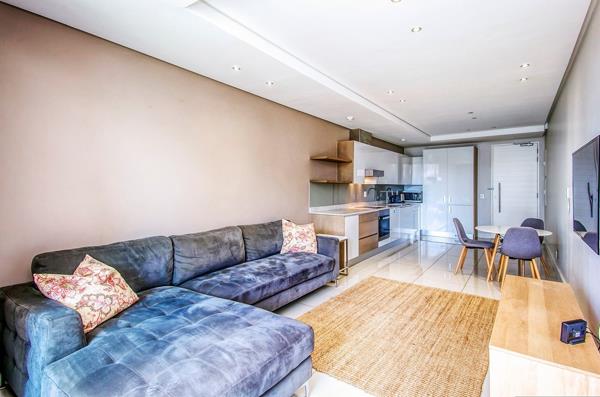 This glossy one bedroom apartment offers every luxury. From beautiful fittings and finishes, to sweeping views from the 7th floor, this apartment has it all. A white gloss open-plan kitchen features integrated Miele appliances including fridge/freezer, washing machine/dryer and dishwasher with creamy white Ceasarstone counters. The bedroom also enjoys the view from a large picture window and offers a desk, ample cupboard space and has a luxurious en suite bathroom with bath and shower. The apartment has one underground parking bay as well as a storeroom. Furniture and curtaining can be negotiated.