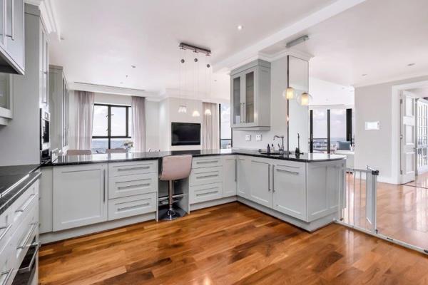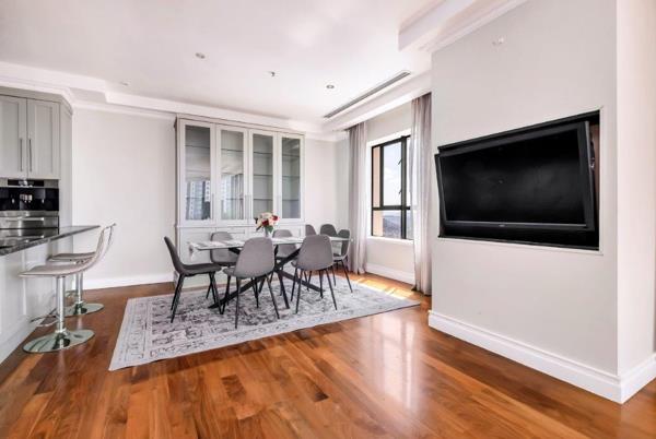 The gourmet kitchen is a dream for culinary enthusiasts, featuring premium Miele appliances, sleek cabinetry, granite countertops, and generous space for effortless entertaining. Flowing seamlessly from the kitchen are the expansive dining and living areas, framed by floor-to-ceiling windows that reveal uninterrupted views of the Johannesburg skyline.