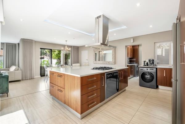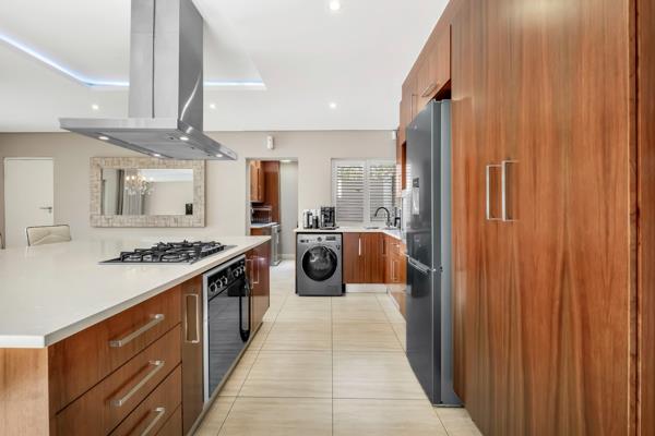 The sleek contemporary kitchen showcases a harmonious blend of light Caesarstone and wood accents offset by modern LED downlighting. A generous centre island, perfect for casual dining and entertaining, features a 5-plate gas hob with suspended extractor and an electric oven. Excellent storage and space for two under-counter appliances plus a single-door fridge ensures practical convenience. A separate scullery opens to a private laundry courtyard.