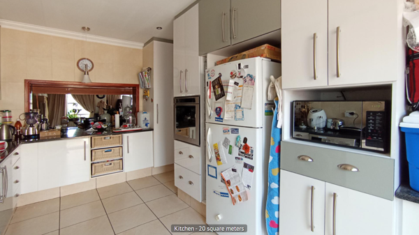 The home offers two distinct dining areas, one of which is a spacious 15 sqm room with a vaulted ceiling and exposed wooden beams, adding character. The expansive 36 sqm lounge also features attractive exposed wooden beams, ample natural light from multiple windows, and an air conditioning unit for comfort. With 128 sqm under roof on a 319 sqm erf, this property provides comfortable living spaces.