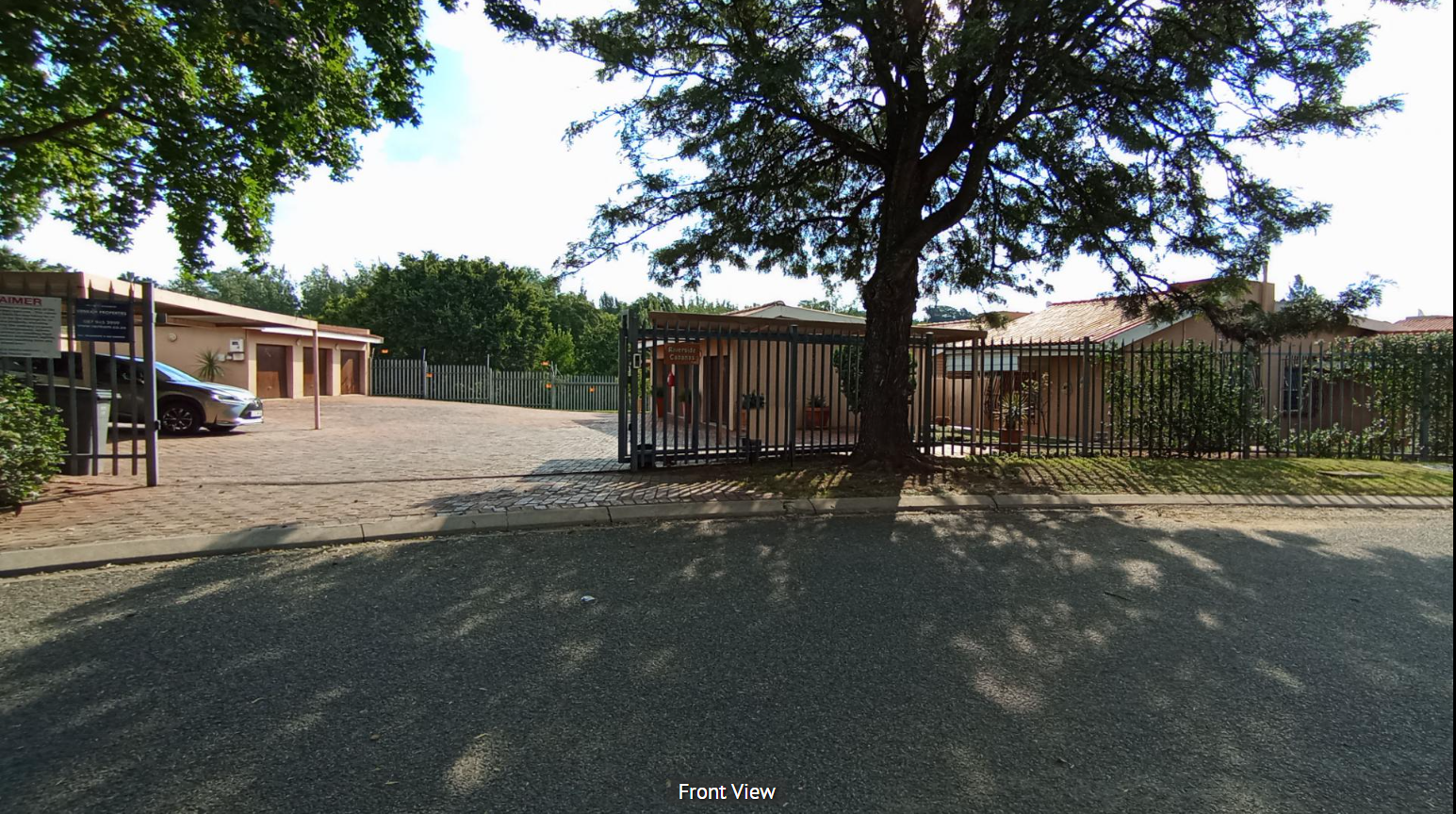 Discover this inviting 2-bedroom, 2-bathroom residence nestled within a secure estate in Sandton Central. The property presents a well-maintained exterior with a prominent security gate, robust fencing, and a paved driveway leading to a garage and additional parking bay, ensuring both convenience and peace of mind. Mature trees enhance the curb appeal, offering a welcoming first impression.