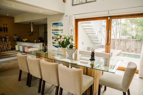 Ground floor consists of a dining room, 2 lounge areas, open plan kitchen with closed scullery/pantry and a guest toilet. Sizable patio with built in has braai, facing pool. 2 garages and additional parking. Maids quarters of single room, small kitchenette and bathroom.