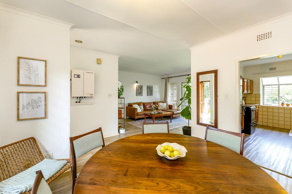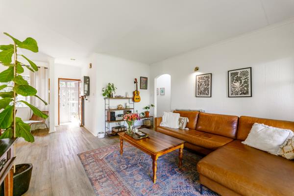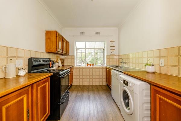 The open plan living areas encompass both the dining and lounge spaces, featuring large north-facing sliding doors inviting abundant natural light, that lead out to a covered balcony overlooking the lush gardens. Adding a touch of elegance, laminate flooring runs throughout these areas. The kitchen is equipped with space for two under-counter appliances and boasts a large north-facing bay window, perfect for a charming kitchen herb garden.