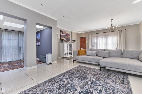 Step into this neat, ready to move in home and be welcomed by the open-plan dining and lounge areas, designed for relaxed living, beautifully finished with porcelain tiling. A set of stacking doors seamlessly connect the indoors to the outdoors. A second lounge or dining space, enhanced by skylights, offers additional versatility and also opens through sliding doors to the garden, filling the home with light and air.