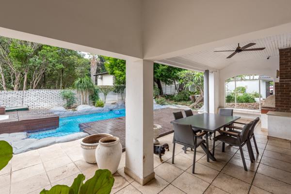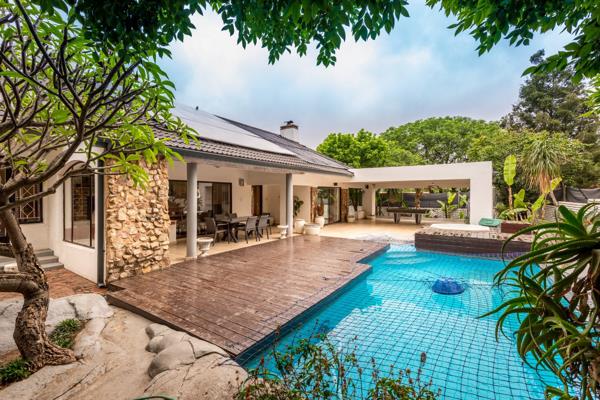 The outdoor oasis is an entertainer''s dream, featuring two sprawling covered patio, a sun-drenched deck, and a sparkling swimming pool complemented by a luxurious jacuzzi, a braai area a built in pizza oven overlooks a well kept garden, sustained by an irrigation system.. Practical amenities include staff quarters with outside toilets, ample storage, and a pet-friendly environment.