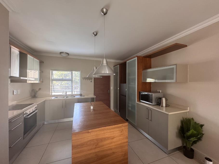 Discover modern living in this inviting 88 sqm apartment, ideally situated within a secure complex in Wendywood, Sandton. The residence features a contemporary open-plan layout, seamlessly connecting the living and kitchen areas. The kitchen is a highlight, boasting a central wooden island, sleek grey cabinetry with wood accents, integrated stainless steel appliances, and ample counter space, perfect for both everyday meals and entertaining. The living area is brightened by large windows and sliding glass doors that lead to a private balcony, offering lush green views and a stylish brick accent wall that adds character.