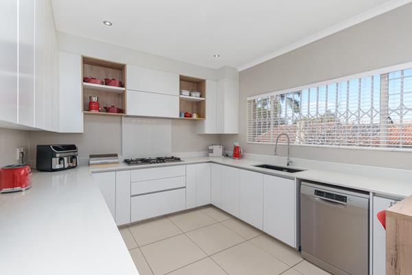 Adjacent to the living areas is the state of the art, sleek dream kitchen with Caesarstone counters, built in oven, microwave and fridge/freezer, gas hob, breakfast bar and space for one appliance. The built in appliances are all Siemens appliances. Laundry happens elsewhere, in the laundry room.