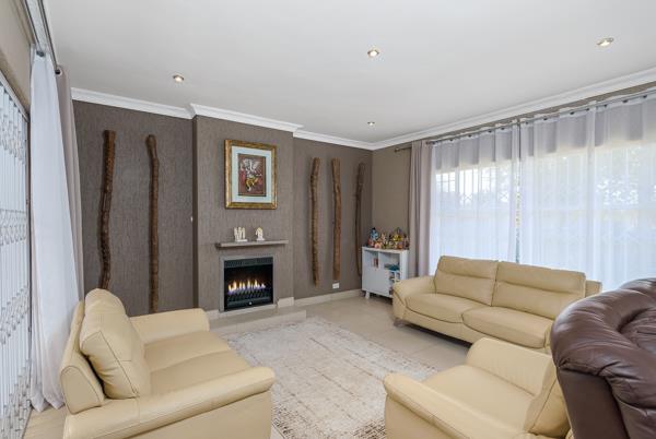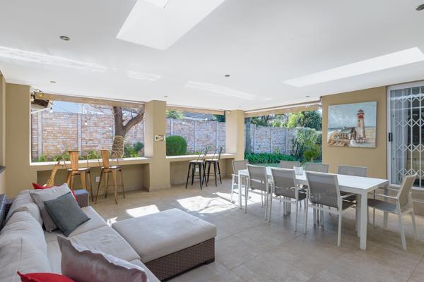 Large open plan living and dining areas that flow out onto a large covered patio overlooking the lush green garden. The living areas have a wood, as well as a gas fireplace and a guest cloakroom.
