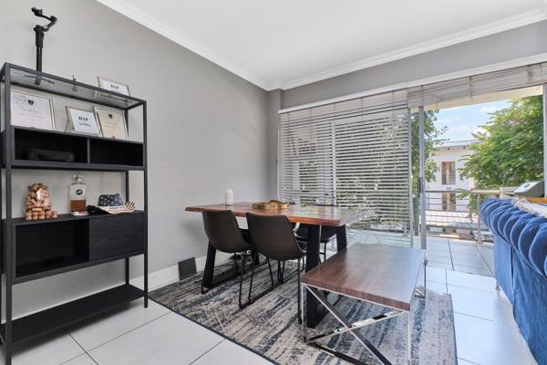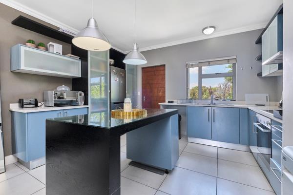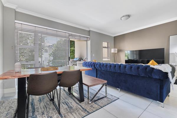 The open-plan layout features a modern tiled kitchen, dining room, and lounge that flows seamlessly onto a generous balcony complete with a built-in server and stand-alone braai perfect for entertaining.