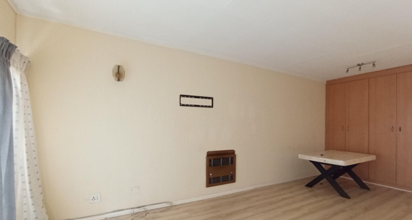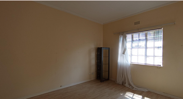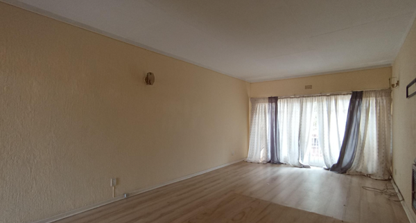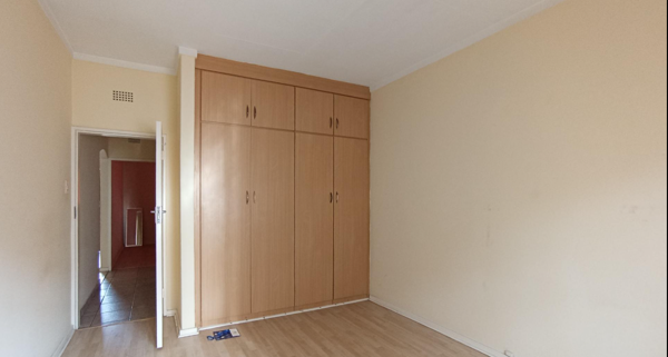 Accommodation comprises two well-proportioned bedrooms, each fitted with laminate flooring and neutral walls. One bedroom offers extensive built-in wooden cupboards, providing generous storage solutions. The apartment is serviced by a single, well-appointed bathroom. Additional security features such as burglar bars and security gates are installed for enhanced safety.