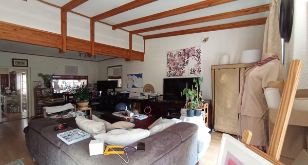 Step inside to a thoughtfully designed interior. The modern kitchen is a highlight, featuring sleek two-tone high-gloss cabinetry, dark granite countertops, and integrated appliances for a seamless culinary experience. The spacious lounge area offers character with its vaulted ceilings and exposed wooden beams, complemented by skylights that invite abundant natural light. An air conditioning unit and a cozy fireplace provide comfort throughout the seasons.