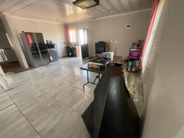 Inside, the main residence boasts spacious, open-plan living areas characterized by light-coloured tiled flooring that ensures easy maintenance and a bright ambiance. Ample natural light streams through large windows, illuminating the comfortable lounge and dining spaces. The functional kitchen area, equipped with a large refrigerator, offers a practical foundation with significant potential for a bespoke design to perfectly match your culinary aspirations and style preferences.