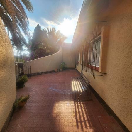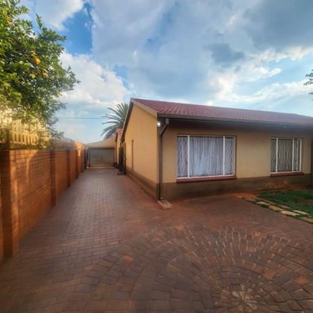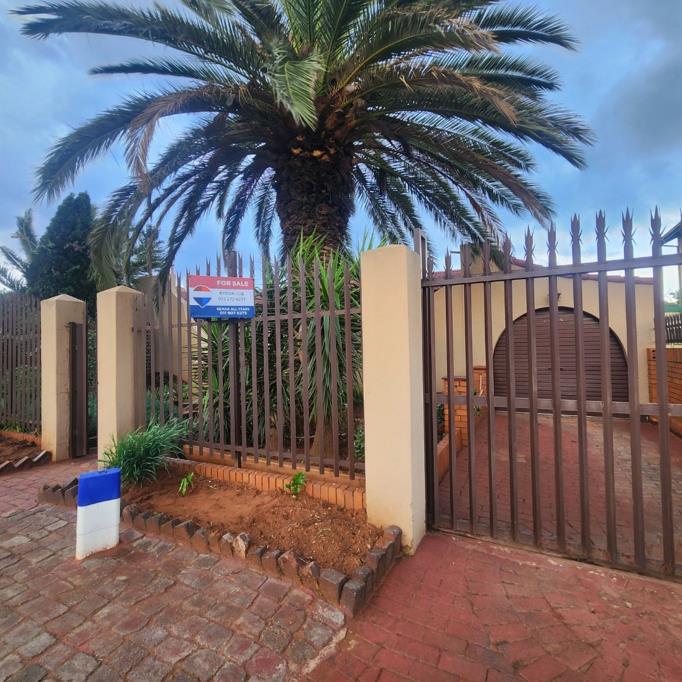Discover this inviting four-bedroom residence nestled in the established community of Eldorado Park, Soweto. The property immediately impresses with its secure frontage, featuring a robust metal fence, concrete pillars, and secure gates, complemented by mature landscaping including prominent palm trees and paved pathways. Security is further enhanced by an alarm system and security bars on windows, ensuring peace of mind for residents.