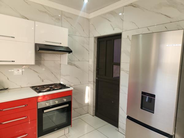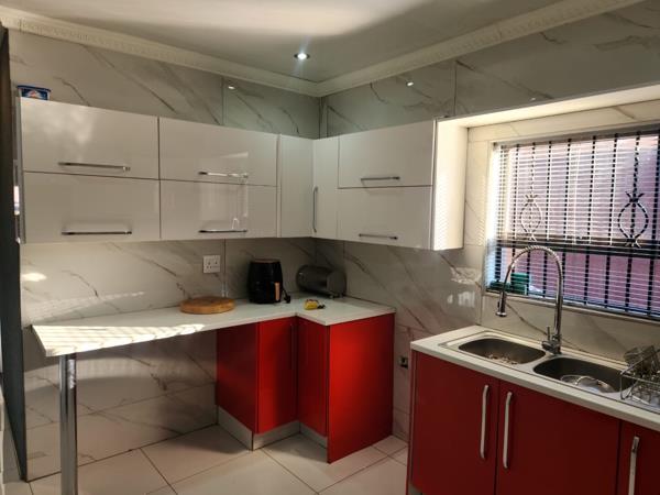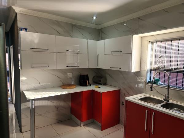 This massive corner house in Jabulani offers an incredible amount of space with five large bedrooms, two of which boast sleek glossy sliding cupboards. The living area features a generous open-plan lounge and dining space, complete with a cozy fireplace and elegant gamazine walls, setting a warm and inviting tone.