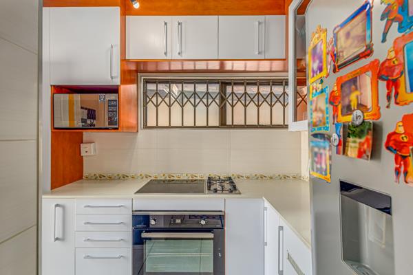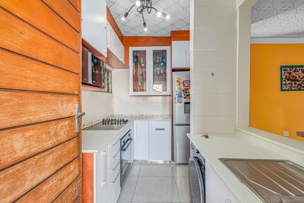 The modern kitchen, includes tiled floors and walls and stylish built-in cupboards, makes cooking both practical and enjoyable.