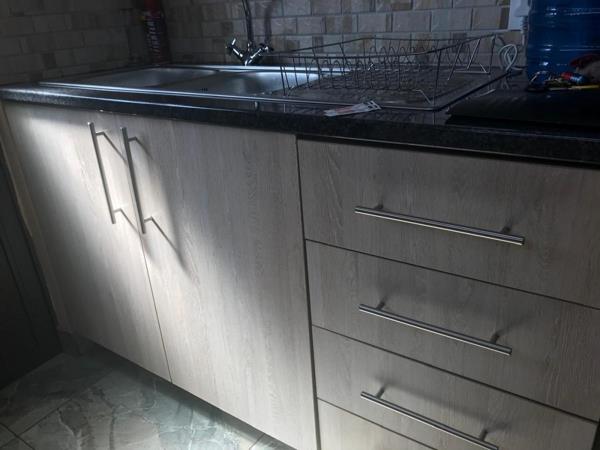 A spacious lounge connects smoothly to the kitchen, which is equipped with built-in cupboards and tiled flooring throughout.