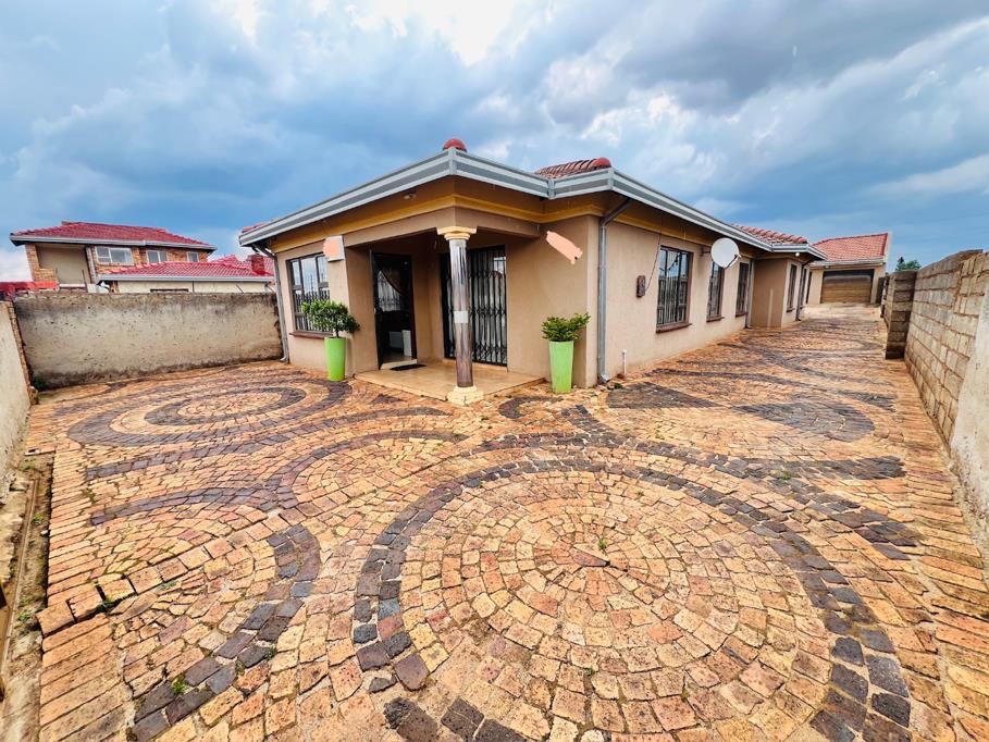 Discover this inviting family home located in the vibrant suburban community of Protea Glen, Soweto. The property immediately impresses with its distinctive kerb appeal, featuring a light brown stucco exterior, a classic red tile roof, and an extensively paved front yard and driveway. This unique brick paving, with its intricate circular patterns, offers both aesthetic charm and practical, low-maintenance outdoor living. Enhanced security is a key feature, with visible security bars on windows and robust security gates at the main entrance, providing peace of mind.