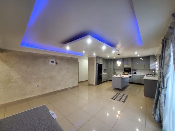 Step inside to an intelligently designed open-plan layout that seamlessly connects the living spaces. The heart of this home is its sleek, modern kitchen, equipped with glossy grey cabinetry, pristine white countertops, and a functional central island featuring an integrated gas hob and secondary sink. Integrated appliances, stylish pendant lighting, and contemporary recessed spotlights with ambient blue LED accents create an inspiring culinary environment. Adjacent to the kitchen, the spacious lounge area, perfect as a family or TV room, showcases clean tiled flooring and modern ceiling designs with various lighting options, including striking red ambient strip lighting, enhancing the versatile atmosphere. Sliding doors further contribute to the open feel and natural light.